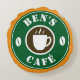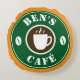 Almohada decorativa personalizada para cafetería. Diseño redondo de grano de café y taza. Personaliza con el nombre de la empresa, empleado, barista o nombre de la empresa de café / bar. Colores verde y marrón. Decoración de hogar trendy para sala de estar de cafetería. Color de fondo naranja o personalizado.