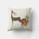 Una almohada de tiro magnífica del día de fiesta del navidad ofrece un ciervo marrón y porciones de ornamentos brillantemente coloreados del estilo del vintage en un fondo del blanco del alabastro.