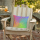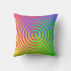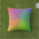 Esta colorida almohada exterior presenta un patrón de arco iris espiral abstracto que gira alrededor de un objetivo central en colores verdes, azules, amarillos, naranjas y rojos.