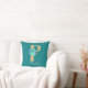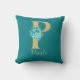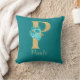 Hermosa almohada con letra 'P' de purpurina dorada con rosas aqua y ramo floral dorado sobre fondo verde azulado. Personaliza con nombre en fuente de color dorado.