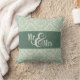 Añada los nombres de la pareja y la fecha del boda al dorso de la almohada decorativa "Mr & Mrs.", de color verde vintage. Diseñado por Simply Put por Robin; cortesía de Anaz Designs.