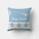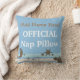 Almohada oficial de la siesta del jubilado, personalizable (AÑADA EL NOMBRE) en frente. Azul claro del fondo flecked con la luna y las estrellas marrones en la frontera inferior. Detrás de la almohada en colores de coordinación dice, "pozo del sueño".