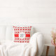 Una almohada inicial personalizada con una letra de escritura en medallones blancos sobre una cinta falsa roja sobre un patrón retro de fresas rojas y flores blancas sobre un rosa.