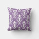 Almohada de tiro decorativa con un modelo púrpura del damasco. Hecho a mano en los E.E.U.U. Almohada grande del algodón con un diseño del damasco del vintage en blanco en un fondo púrpura.