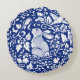 Mi placa de cerámica original de conejo azul y blanco con derechos de autor se reinterpreta sobre una almohada redonda. Perfecto para una cocina azul y blanca.