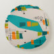 Almohada redonda de inspiración moderna de mediados de siglo en verde azulado, verde y naranja con un toque atómico.