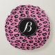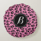 Almohada redonda de throw con estampado de leopardo rosa y monograma. Patrón de manchas de animal salvaje personalizado con la letra inicial del nombre. Tipografía elegante. Decoración hogareña linda y femenina para mujeres y habitación de niñas.