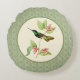 Almohada de tiro redonda con un ilustracion del vintage del colibrí magnífico. Un colibrí del verde y del oro se encarama en la rama de la planta tropical con las flores rosadas brillantes; enmarcado y apoyado con un modelo verde claro del damasco. Almohadas de tiro cuadradas a juego disponibles.