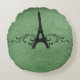 Almohada redonda de color verde y elegante de estilo vintage francés, con un diseño de la Torre Eiffel adornado con remolinos y puntos de moda y un falso fondo texturado de papel. Esta almohada de temática parisina ofrece una pizca de fantasía francesa. Fácil de personalizar, simplemente agregue el texto personalizado de su elección en el campo de texto proporcionado. Haga clic en el botón "Personalizar" para encontrar opciones de personalización adicionales.