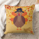 Esta almohada de tiro se muestra con hojas de otoño y una huella de pavo de Acción de Gracias en un fondo claro de color dorado.