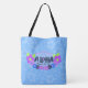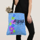 Color azul y violeta. Las flores personalizados divertidas, femeninas y caprichosas ayudan a enviar el mensaje de que aloha significa hola! Este diseño tiene varios colores. Esta bolsa de playa es reversible.