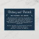 Tarjetas de recepción/alojamiento de Boda azul y blanco de la Armada Náutica - presenta un fondo azul marino con varios tipos de letra elegantes en la parte superior y siluetas blancas de gaviotas. Informe a sus huéspedes de cualquier información especial sobre bodas y habitaciones de hotel cercanas para hacer sus viajes a su gran día simple. Simplemente rellene estas tarjetas con las invitaciones y tarjetas RSVP correspondientes. Las tarjetas de recepción presentan un diseño de burlap impreso. Encontrar productos coincidentes en esta página. El material de la tarjeta se establece en blanco; sin embargo, puede cambiar el material a crema, lino, metálico, cáscara de huevo en la opción 2). (debajo de la característica de personalización).