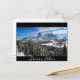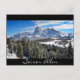 Postal con la montaña Langkofel (Sassolungo) Dolomitas y árboles en la nieve en la Alpe di Siusi (Alma Seiser) en Tirol del Sur, Italia en invierno con una frontera negra y el texto: "Seiser Alm".