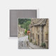 Imán fotográfico cuadrado de las antiguas cabañas de color miel en piedra de Cotswold con lonchas en el techo en la pequeña, pintoresca y de cuento de hadas del Castillo Combe en los Cotswolds, Inglaterra, Reino Unido con el texto: 'Inglaterra, el Castillo Combe'. ¡Un gran recuerdo!