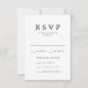 Nuestras tarjetas de respuesta boda "Amadas" de moda cuentan con una paleta de colores clásica en blanco y negro, perfecta para bodas en cualquier época del año. El lado inverso de las elegantes tarjetas RSVP para bodas presenta un diseño tradicional de patrones vinculados. Personalice las elegantes tarjetas de respuesta boda con sus detalles de boda personalizados y opciones de cena.