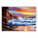 Pintura de una playa al amanecer con olas estrelladas y gaviotas contra un colorido cielo rosa y naranja.