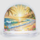 Escena luminosa de playa tropical con amanecer vívido, olas turquesas y flores vibrantes bajo palmeras que se mecen, creando un entorno paradisíaco pacífico y dinámico.