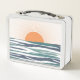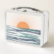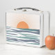 Resumen ilustracion de la salida del sol con sol naranja y decoración de olas de mar azul, blanco y turquesa