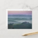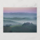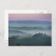 Postal de un amanecer nublado con un cielo rosado y niebla entre las colinas toscanas sobre la casa de campo agriturismo podere il Belvedere en la Valdorcia (Valle de Orcia) entre Pienza y San Quirico en la Toscana, Italia.
