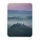 Imán fotográfico vertical con un amanecer nublado con un cielo rosado y niebla entre las colinas toscanas sobre la casa de campo agriturismo podere il Belvedere en Valdorcia (Valle de Orcia) entre Pienza y San Quirico en la Toscana, Italia.