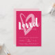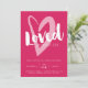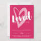 Una invitación para un fiesta El día de San Valentín en casa o en la iglesia, o para un evento de una iglesia joven/femenina. Este moderno diseño tipográfico presenta un corazón rosa claro dibujado a mano con "Amado" en letras con pincel blanco y la referencia de las escrituras Jeremiah 31:3 sobre un fondo de rosa fucsia. Hay piezas de coordenadas disponibles.