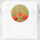 El pegatina redondo de la amapola roja vibrante florece en un campo verde por completo de amapolas. Tiene una emoción fuerte del hapiness, de la primavera y del verano.