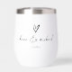 Los elegantes textos manuscritos y los acentos de pincel se utilizan para crear las piezas de esta hermosa y moderna suite boda. El diseño del vaso de vino termal sin tallo que se muestra aquí en negro, incluye una plantilla para añadir fácilmente sus nombres y fecha de boda. Una forma de corazón dibujada a mano añade un acento romántico adicional. Busque ID940 para ver todos los productos de este conjunto de bodas.