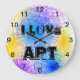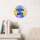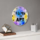 Guay gran reloj de pared redonda con círculos de espiral coloridos en azul claro, violeta y amarillo sobre un fondo blanco. Con la redacción, me encanta el arte en un divertido texto negro sobre fondo blanco. Reloj divertido para un dormitorio, sala de juegos, sala de arte escolar. Obra gráfica original de TamiraZDesigns. Visita mi tienda para ver más artículos originales: www.zazzle.com/tamirazdesigns*