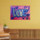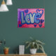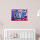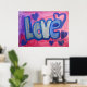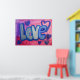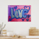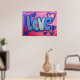 Pintura de la palabra "amor" en algodón azul dulce contra fondo de chicle rosa y púrpura. Los corazones morados y azules bailan alrededor de las letras. En la parte superior hay una capa clara de purpurina azul y plateado. Puede personalizar esta impresión de poster de arte de amor con el botón "Personalizar". Añade tu propio texto e imágenes para un regalo de amor personalizado!
