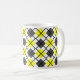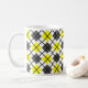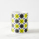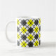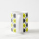 Una taza de café fresca que ofrece un modelo de la impresión del argyle en gris, negro, amarillo y blanco.