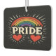 Muestre sus colores reales mientras viaja con este vibrante y vintage refrigerador de aire del coche del Orgullo Gay! Con un arcoiris audaz que arca sobre la palabra "ORGULLO" con letras blancas angustiadas, flanqueado por dos corazones rojos brillantes y líneas radiantes, este diseño aparece en un elegante fondo negro. Perfecto para el Mes del Orgullo, los desfiles o la visibilidad cotidiana, este ambientador es un poderoso símbolo de amor, aceptación y unidad.