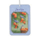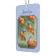 Dos pájaros planos occidentales se colocan en un melocotón, mientras que un tercer pájaro se sienta en una cesta de madera tejida llena de fruta recién cosechada lista para el mercado. Acentuado con un fondo con motivos azules coincidente.