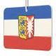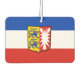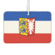 Freshener de aire con bandera variante de Schleswig-Holstein; diseño con tricolor horizontal de rojo, blanco y azul, y con el escudo de armas del estado en el centro