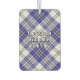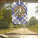 Bandera de escudo del clan MacPherson rodeada por una correa y hebilla sobre fondo escocés de vestimenta azul. Texto personalizado en ambos lados.