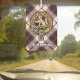 Insignia de escudo del clan MacPherson rodeada por una correa y hebilla sobre fondo de tartán de caza. Texto personalizado en ambos lados.