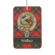 Insignia escudo Clan Wallace rodeada por una correa y hebilla sobre el fondo tartán. Texto personalizado en ambos lados.