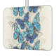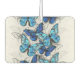 Composición vertical de mariposas morfo realistas, azules y blancas sobre fondo texturado gris. Mariposa morfo azul.