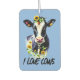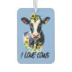 A dose of "Fresh Country Air" that actually smells good for your commute! This cute cow car air freshener features a funny Holstein wearing a bright yellow sunflower on its head and the words "I Love Cows". This farm animal design adds a charming touch to your rearview mirror while keeping your vehicle smelling delightful. The perfect small auto accessory for cow lovers wanting to customize their car, truck, or SUV with a cheerful country vibe.
