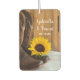 Personalice el encantador Country Sunflower Western Boda Air Freshener con los nombres de la novia y el novio y la fecha de la ceremonia matrimonial. Crear favores de boda boda personalizados, guardar los anuncios de fechas o mantener el regalo para los recién casados, damas de honor y asistentes de bodas. Este rústico personalizado de moda boda occidental presenta una pintoresca fotografía floral de un par de botas de vaquero de cuero marrón y flor de girasol amarillo con un fondo de madera marrón. Perfecto para su informal pero elegante granja rural, granero rústico, rancho o temática boda occidental.