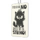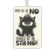 A funny, sarcastic black-and-white graphic design showcases a black cat with frazzled fur and a scowling expression. The black handwritten text says, "First of all, no. Second of all, still no!" Available on a wide variety of products, this design makes a perfect gift for cat lovers.