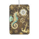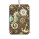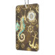 Fondo de madera marrón con mar, cresta mecánica, volante antiguo, ancla dorada y varios engranajes de oro y latón. Estilo Steampunk.