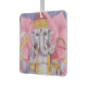 Un pintor de canapé cuadrado de 18" de Ganesh con aire fresco. Ganesh es un dios hindú. Es el removedor de obstáculos, patrocinador de las artes y las ciencias, señor del intelecto y la sabiduría, dios de los comienzos, y patrocinador de las letras y el aprendizaje. Sostiene su propio colmillo roto en su mano inferior derecha y sostiene una exquisitez, en su mano inferior izquierda. En una parte superior del brazo sostiene un hacha, y en la otra parte superior del brazo, una soga. Lo he colocado sentado frente a una flor rosada de loto, como parte de un símbolo de nuevos comienzos que se están desarrollando.
