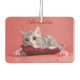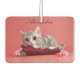 Un lindo gato de tabby, personalizado gris y blanco, se coloca sobre una almohada de color granate con claveles rosas cerca.