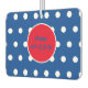 A blue background with white polka dots... red center circle with blue cursive lettering and white accents...