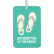 La vida es mejor en la playa, adorable coche con aire fresco. Una idea divertida para hombres, mujeres y chicas. sandalias de playa / chanclas con corazones y texto personalizado. Diseño fresco para refrescar tu auto con diferentes olores fríos para enmascarar el olor de perro o mascota y otros sucios olores malolientes. Crea tu propia casa para amigos, marido, esposa, familia, papá, mamá, madre, padre, tío, abuelo, hermano, hijo, hermana, esposa, compañero, compañero, amante del océano, nadador, buceador, marinero, capitán de barco, jubilado, pájaro de nieve, jubilado, jubilado, etc. Aire fresco personalizado con zapatillas de verano. Hacerlo oler a un coche nuevo o a la playa y al mar. Diseño de doble cara. Añade tu propio lema gracioso o cita inspiradora opcionalmente. También es bueno que la fiesta de bodas de verano favorezca la idea de regalo. Color de fondo azul turquesa o personalizado.