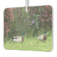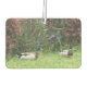 Una fotografía de dos hermosos machos mallard se patea hacia afuera para dar un paseo por el césped sobre un paraviento.