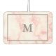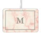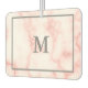 Un gran monograma gris se encuentra en el centro de un fondo de mármol rosa.