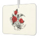 Contorno, luna de media luna mecánica con engranajes, decorada con rosas rojas con tallo negro y hojas sobre fondo blanco. Steampunk