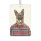 Un pastor alemán lleva gafas y una camisa de manta sobre un fondo blanco. Se puede cambiar el color del fondo blanco.