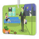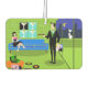 Este Personalizado urbano retro, Couple Air Freshener, presenta el dibujo personalizado de un apartamento de estilo penthouse con una decoración elegante y vistas a un horizonte urbano. El apartamento cuenta con un suelo verde y una pared de ladrillo verde. En la pared hay cuatro pinturas de tela estiradas clásicas de la película Martini, también disponibles en la tienda Zazzle de StrangeLittleOnion (¡insinuación!). Tres de las impresiones tienen un fondo turquesa y una está sobre un fondo negro. Debajo de las estampas de lona, hay un sofá moderno azul de mediados de siglo. En el sofá hay una bonita y sofisticada belleza de pelo cuervo. Ella lleva un vestido clásico, pequeño, negro con un corpiño rosado caliente. En el lado opuesto de la habitación hay un hombre agradable, alto, oscuro y guapo. Lleva traje negro, camisa blanca y corbata verde. De un lado, él está sosteniendo un álbum de discos de vinilo y, de otro lado, está sosteniendo una portada de un álbum divertido. En el suelo, un otomano naranja sostiene un récord de jugador verde y negro. La portada de otro álbum, apuntada contra el otomano, tiene un disco que sale de un costado. También hay tres álbumes de vinilo coloridos diseminados por el suelo. Detrás del hombre, podemos ver a través de las puertas correderas de cristal un balcón verde. Un gato blanco vestido con un collar rosado está encaramado en el borde del balcón. Más allá del gato, hay un impresionante horizonte urbano con rascacielos y una luna creciente amarilla. Si así es como vive la otra mitad, ¡inscríbeme!